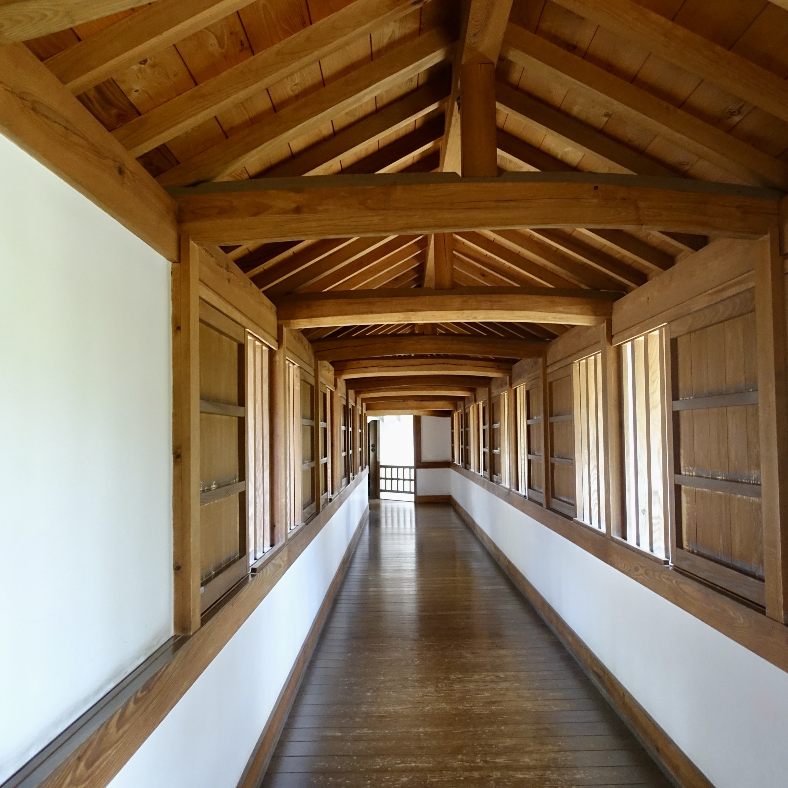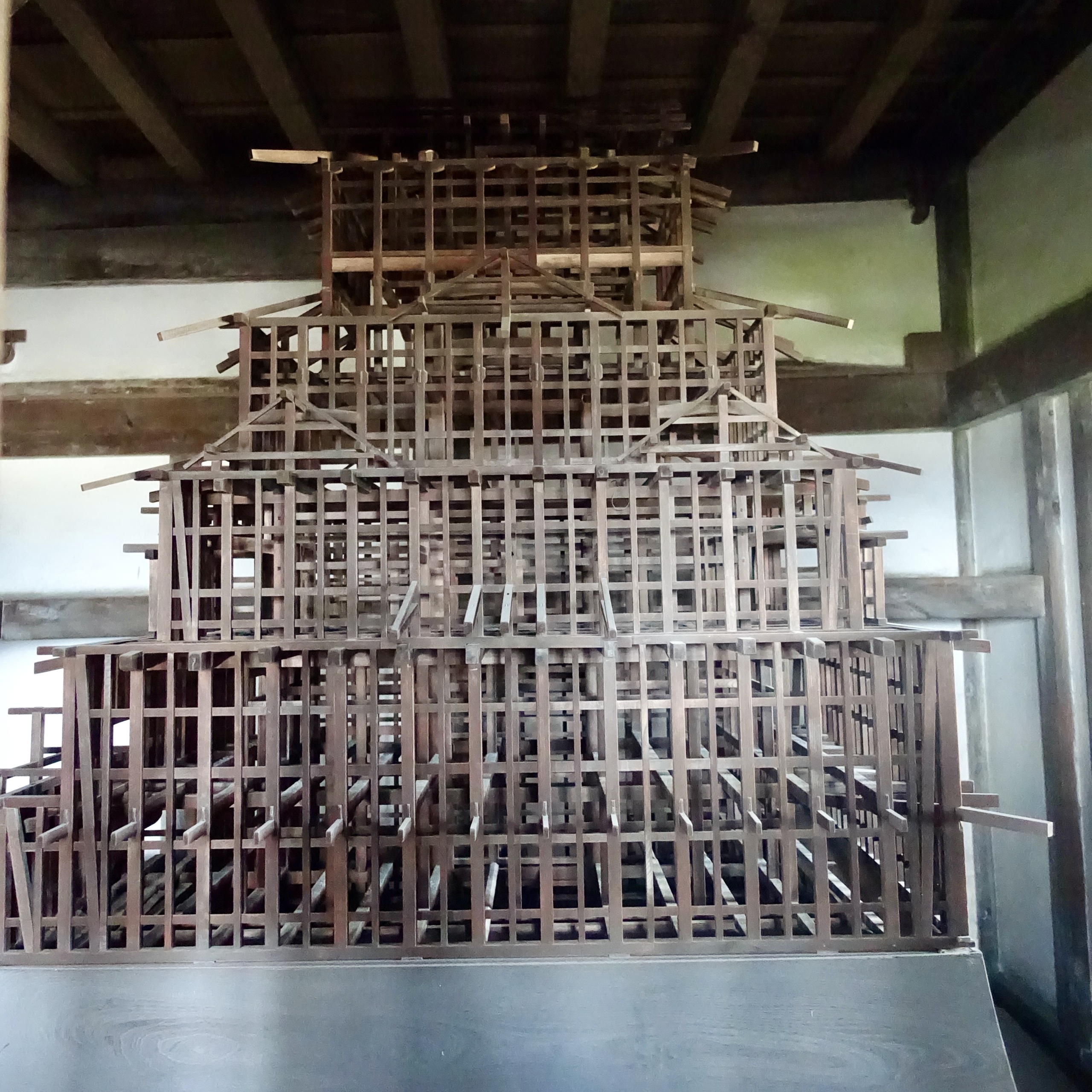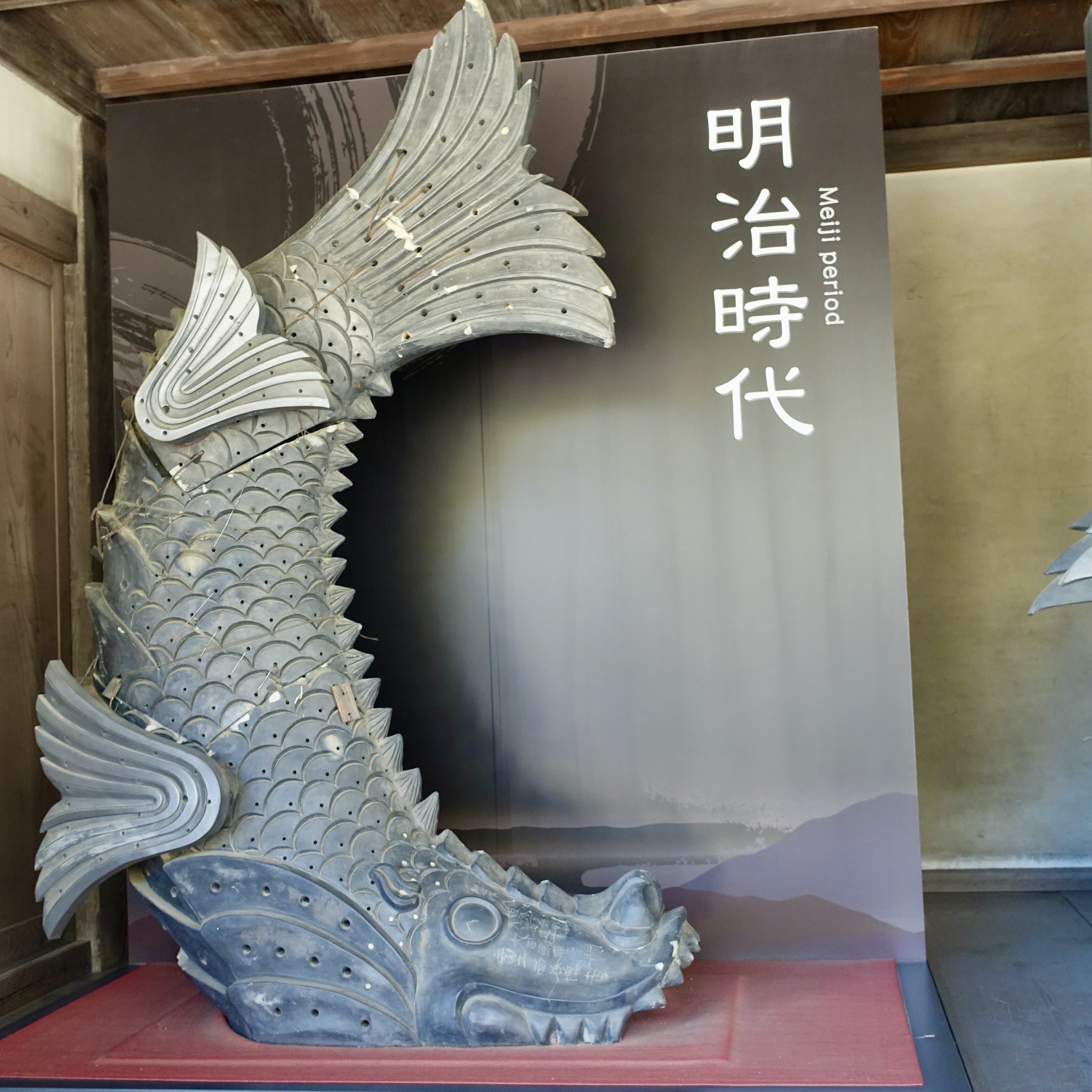 J’observe les sceaux qui apparaissent sur les murs du château et l’impressionnante ossature bois. Nous grimpons les étages et au dernier, il y a un poisson qui surplombe le toit. C’est un Kinshachi, animal mythique protégeant paraît-il du feu le toit du donjon. Puis, nous repartons à la gare, achetons un bento et prenons le train vers Hiroshima.